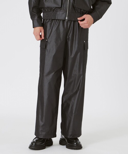 リュクスなムード漂うオイル調カーゴパンツ【素材】ポリエステル×ナイロンのツイル素材を使用。高密度に織り込んだツイル素材を日本有数の技術メーカー「小松マテーレ」にてBJ加工(小松マテーレ独自技法)を施し、程よいハリコシと独特な形状記憶感に仕上げています。ナチュラルストレッチが効いているの履き着心地もよく、光沢加工も施しているので、表面に微光沢感がありリュクスなムードを演出します。【シルエット/デザイン】ゆったりとしたワイドストレートシルエット。ウエスト部分はゴムとスピンドル仕様となっており、着脱がしやすく、履き心地も快適です。裾にもスピンドルを配しており、絞ることでシルエットの変化を楽しんで頂けます。大きめのカーゴポケットが利便性とデザイン性を兼ね備えています。スピンドル先のチップやポケットフラップのリベットのシルバーがカラーアクセント。【スタイリング/その他】同素材のブルゾン(品番:61F01630)と合わせたセットアップスタイルがおすすめです。【お手入れ方法】こちらの商品は、ご家庭での洗濯が可能です。━━━━━━━━━━━━━━━━━━━━━━━━━━お買い物をお楽しみ頂くために<商品のお気に入り登録>完売カラーの再入荷通知など、お得な情報をお届けします。<注意事項>この商品はサンプルでの撮影を行っています。実際の商品とイメージが異なる場合がございます。撮影環境により、光の当たり具合で色味が違って見える場合があります。あらかじめご了承下さい。
