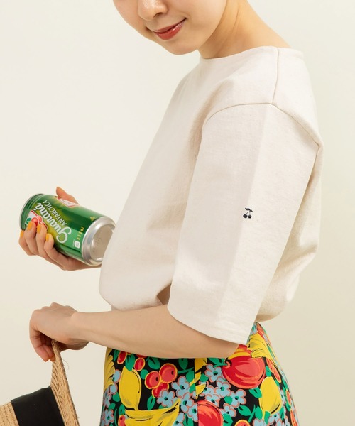 定番でお作りしている、空紡糸ボーダーの5分袖バージョンです。 硬くシャリ感のある風合いが特徴の空気精紡糸で作成した別注生地を使用。 見た目はベーシックな生地ですが、ハリ感や目面にこだわり極限まで度目を詰めて編み立て独特の風合いを作りました。 お洗濯を繰り返してもヨレにくい丈夫な素材感がスタッフからも好評で、愛用率が高いシリーズです。 袖にはブランドのキーアイコンでもある小ぶりなチェリー刺繡が施され、 裾のスリットの内側は配色になっているのもポイント◎ 素材から細部のディテールまで抜かりなく、こだわりが沢山詰まったアイテムです。 ------------------------------------------------------------- 【 価格改定のお知らせ 】 昨今の原料や輸送コスト高騰に伴い 2025年9月6日の販売分から 価格改定を実施させていただくこととなりました。 今後もみなさまに喜んで頂ける商品をお届けできるよう努めて参ります。 価格改定以前は以下の品番で販売しておりました。 ※仕様や素材などの変更はございません。 旧ブランド品番:0101CT026231 商品名:空紡糸ボーダー チェリー刺繍5分袖プルオーバー ------------------------------------------------------- ----------------------- 透け感:なし 裏地:なし 伸縮性:なし 光沢感:なし ----------------------- 【素材の特性・お取り扱いの注意】 ・取り扱いの注意については取り扱い表示をよくご確認の上、着用をお願い致します。 ・ブルー、レッド、ネイビーは、配色使いになっておりますので、長時間水につけておいたり、濡れたまま放置しておりますと、白場に汚染する事がありますので、ご注意下さい。 ※撮影画像は、光の当たり具合やモニターの環境により色味が違って見える場合があります。あらかじめご了承ください。 ※着用の商品はサンプルで撮影しております。お届けする実際の商品と仕様、加工、サイズが若干異なる場合がございます。