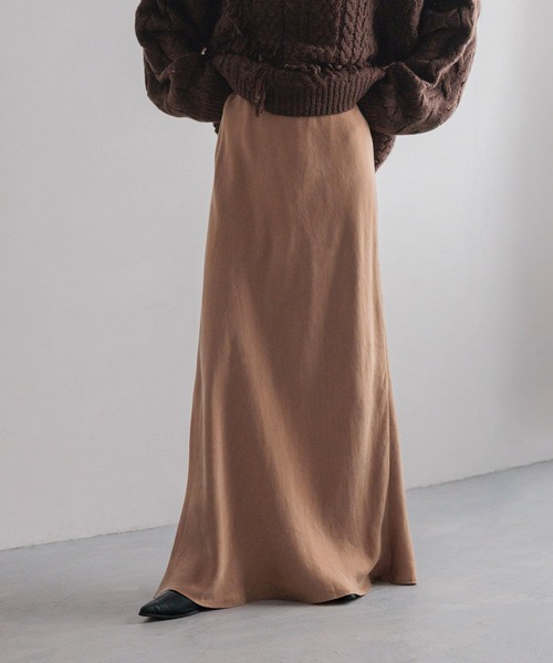 ■素材■ 全面にレーヨンフィラメント糸を使用しており、程良い光沢としなやかな風合いが特徴の素材です。 特殊加工によるフィブリルタッチで上質な素材感を表現しています。 ■デザイン■ セミフレアシルエットの秋冬らしいフィブリル素材を使用したスカート。 ウエストはオールゴム仕様になっていて、着用時のフィット感・伸縮性を持たせるためにバイアス裁断にしています。 腰回りは程良くフィット感がありますが裾にかけて少しフレアなシルエットになっているので 動きやすさも兼ね備えた上品なスカートです。 ■スタイリング■ シャツやオーバーサイズのカットソーとの合わせがバランスよく着こなせます。 きれいめなスカートなのでトップスはカジュアルなもので合わせるのがおすすすめ。 足元はブーツで合わせると女性らしい着こなしに◎。