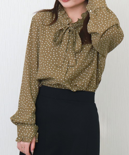 ランダムに散りばれられた小さめドットが甘さ控えめリボンタイとドット柄が華やかさをプラスするフリルシャツ ■point・リボン帯・袖口、ネックラインのフリル使い・ランダムな小さめドット柄(直径約3.5mm)・比翼仕様・しわになりにくい柔らかい素材・袖口、センターフロントの第一ボタンはシャンパンゴールドのカフスボタン(予備ボタン付き)■design小さめのドットプリントは甘すぎず大人顔のリボンタイブラウス。身頃と袖はすっきりとしたデザイン。前立てが釦レスに見える比翼仕立てでONスタイルにもおすすめ。1枚で着るのはもちろん、ジャケットインにも使いやすいシルエットです。リボンタイはスタイリングのアクセントになり、カジュアルにもキレイめにも着ていただけます。一枚あるだけでコーディネートの幅がぐんと広がる、ワードローブに加えたくなるアイテムです!■fabric軽くてサラサラとした素材感洗濯機で洗えてしわになりにくい柔らかな生地……………………透け感:淡色は若干あり厚さ:普通裏地:なし光沢感:なし伸縮性:なしポケット:なし洗濯方法:洗濯機・ドライクリーニング・ウェットクリーニング……………………※ネットに入れてのお洗濯をお勧めいたします。※詳しいお手入れ方法は商品タグをご参照ください。■coordinateカジュアルにもきれいめにも楽しめるアイテムです。甘さのあるブラウスは、辛口アイテムの黒ボトムや、スウェットやデニムとも馴染みます。カジュアルダウンしてハンサムな着こなしに。シンプルなブラックのスカート合わせで、洗練された大人のスタイルを楽しむのもおすすめです。あえてリボンタイをほどいて自然に垂らせばリラクシーな抜け感のあるスタイルに。タイの結び方で印象が変わるので、なりたいイメージに合わせて結び方を変えてコーディネートを楽しめます。------------------------------ブラウス シャツ トップス レディース リボン 水玉 ドット柄 長袖 フリル スタンドカラー オフィスカジュアル 春 秋 冬きれいめ かわいい------------------------------