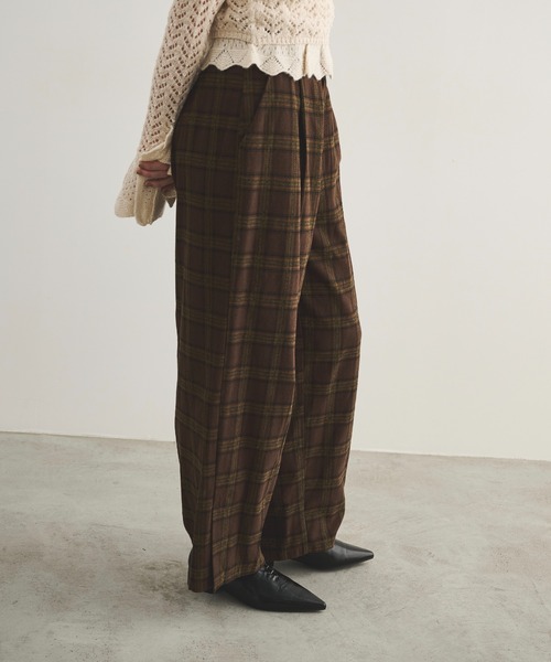 LOSCa 2025 Autumn Collectionシーズンムードたっぷりな大柄チェックパンツ【Design】トレンドのトラッド感あるチェック柄タックパンツ。フロントタックが入っており程よいゆるさがありつつも、センタープレスで綺麗めにも感じられるシルエット。肌触りなめらかで、秋冬らしいフランネル調素材です。【Styling Point】同素材のトップスとセットアップ風に着こなしも可能。1枚で映えるITEMなので、シンプルなトップスと合わせてもシーズンムードが感じられます。裾にはスリットを入れており、ずるっと長め穿いてシューズを見せるのがおすすめ。------------------------------------------------裏地:あり光沢感:なし透け感:なし伸縮性:なし生地の厚さ:普通------------------------------------------------【お買い物をお楽しみいただく為に】▼お気に入り登録をオススメ致します。 『♡』をクリックして下さい。・《商品のお気に入り登録》で再入荷通知や、ラスト1点の通知、セールの際の通知も受け取ることができます。・《ブランドのお気に入り登録》で新作商品や再入荷など、お得な情報を受け取ることができます。【ATTENTION】 ※画像の商品はサンプルです。 実際の商品と色味、仕様、加工、サイズ、素材等が若干異なる場合がございます。※撮影場所やお使いのモニター環境により若干お色味が異なる場合がございます。※製品によっては染料の特性上、湿った状態や汗をかいた状態での長時間の放置、または摩擦により、他のものへ色移りする恐れがありますので、着用時にはご注意下さい。 ※お洗濯は洗濯ネットを使用し、他のものとの混合洗いはお避け下さい。色落ちや色移りの原因となります。 タンブラー乾燥はお避け下さい。 ※風通しがよく、湿気の少ない日の当たらない場所で保管して下さい。 ※また製品加工上、お手元に届く際に匂いが生じる場合がありますが、 ご使用を続けていく事により匂いは軽減されます。