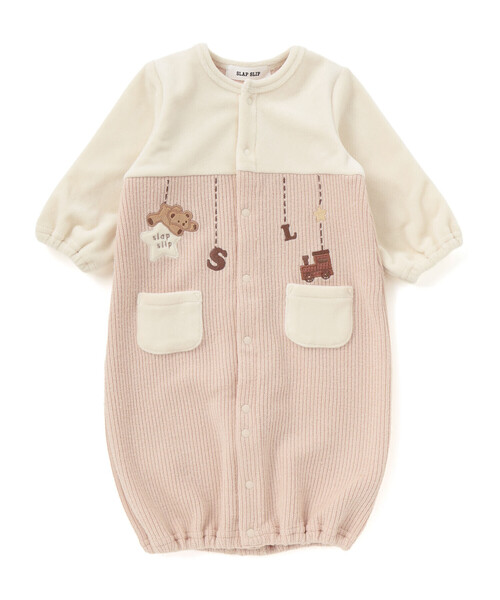 -25AW- 男の子がワクワクするモチーフの刺しゅうをギュギュっと詰め込んだ2WAYオール。 ■デザイン おもちゃ風のパッチ刺しゅうが印象的なアイテム。 刺しゅうはカラーごとに異なるからどっちにしようか悩んじゃう。 ブルー:恐竜やロボットがカッコいい ベージュ:クマさんとSL機関車がかわいい パッと目を引く素材の違う切り替えがアクセントになっています。 付属品がないのでお手入れしやすいのはみんながうれしいポイント◎ 通園やお散歩などのデイリー使いから、ちょっとおめかししたいお出かけまで活躍するシーンの多いアイテムになっています。 スナップボタンで全開になるので、首が座る前の赤ちゃんに着せやすく、新米ママにもおすすめ! 股下にもスナップが付いていて、足をバタバタしてもはだけにくく、オムツ替えもラクラクな設計になっています。 お子様の成長に合わせてスナップボタンでドレス型、パンツ型の2通りで着用可能◎ ワンサイズ展開で生まれたてから6か月ころまで長くご着用いただけるので、サイズ選びが難しいベビーギフトにもおすすめです。 ■素材/機能 デコボコしたテレコ素材にシーズンムードをプラスするベロア、素材の違いを楽しめる触って楽しいアイテムです。 ▼お揃い 1834-77088:飛び出しスタイ 1834-77077:ボアスリーパー 25秋冬アイテム 【SLAP SLIP(スラップ スリップ)】 ~子どもの欲しいをカタチに~ ヨーロッパのこどものように 子どもらしい今しか着れないナチュラルなかわいさを提案 どこか上品で清楚感漂うフレンチカジュアルは いつものコーディネートをさりげなく格上げ