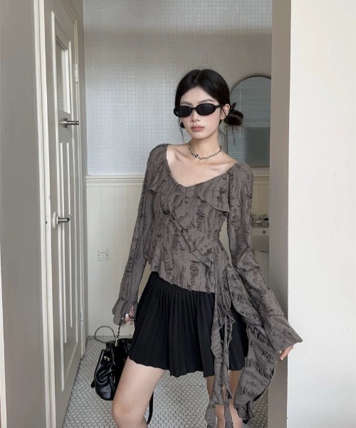 イレギュラーなシルエットが可愛い♡たっぷりのフリルとイレギュラーヘム。カジュアルにもグランジテイストにも着回すことができる優秀トップス。エンジニアブーツでグランジスタイルに。フレアデニムとのレイヤードもおすすめ。※モニター・環境等により実際の商品と多少色味が異なって表示される場合がございます。あらかじめご了承ください。 ※海外輸入品のため、商品の入荷時期によって色合い、生地、デザイン等に若干の違いがございます。 商品の細部仕様は予告なく変更になる場合がございます。