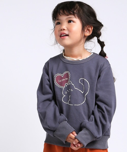 やわらかいスウェット生地に、リラックスしたねこのプリントが映える長袖トレーナー。胸元の「la poche」ロゴ入りハートがアクセントになった、ほっこりかわいいデザインです。カラーは、シックなネイビーと柔らかい印象のラベンダーの2色展開。ゆったりとしたシルエットでレイヤードも楽しめます。裏毛素材で程よい厚みがあり、秋冬のデイリーコーデにぴったり。裾や袖口はリブ仕立てで動きやすく、元気なキッズにも安心の着心地です。 [おすすめのコーディネート]スカートやデニム、ワイドパンツなどボトムスを選ばず着回し力◎。通園・通学や休日のお出かけ、旅行など幅広いシーンで活躍します。お友だちやきょうだいと色違いコーデもおすすめ♪ 同テイストの絵柄でウサギさんのトレーナーもあります🐇(LP25AU010) *80、90サイズのみ左肩にボタンがついており、脱ぎ着がしやすくなっております。 *DILのベビーサイズ商品は、全てホルマリン含有率の検査を通っておりますのでご安心下さい。 la poche biscuit(ラ・ポシェ・ビスキュイ)は、ナチュラルテイストに可愛いモチーフと、さりげなくトレンドを取り入れ、女の子に寄り添うワードローブを提案するブランド。 心躍る華やかなコーディネートが毎日をハッピーに彩ります。