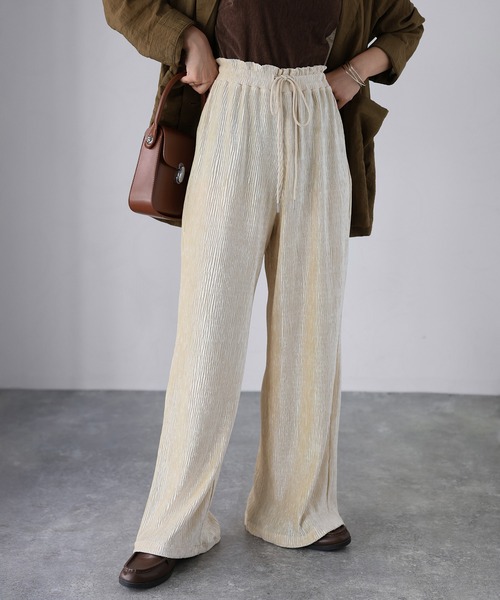 【Riberry ベロアプリーツウエストシャーリングパンツ】\動くたびに揺れる光沢感!/ 縦ライン強調で脚長見えも叶う、秋冬のマストアイテム♪■Stylingしなやかな光沢感と柔らかな肌触りが魅力のベロア素材を使用した、セミワイドパンツが登場しました。長めの丈感が上品で、ラフさときちんと感を兼ね備えた一本。細かいプリーツ加工が施されているので、シンプルながらも動くたびに表情を変え、抜け感のあるスタイルを演出してくれます。ウエストはぐるりとゴム仕様で、イージーな穿き心地を叶えつつも、ストンと落ちるシルエットで大人っぽい印象に。程よいセミワイドのシルエットは、脚のラインを拾いにくくリラクシーな雰囲気がありながら、縦のラインが強調されることでスタイルアップも期待できます!カジュアルにスウェットやオーバーサイズニットと合わせれば抜け感のあるデイリースタイルに。ブラウスやジャケットと組み合わせれば、オンシーンにも対応できるきれいめな雰囲気に仕上がります♪足元はスニーカーでラフにまとめても、ブーツやパンプスで引き締めても◎ シーズンを問わず着回せる汎用性の高さもポイントです。トレンド感とリラクシーなムードを兼ね備えた、ワードローブに加えておきたいアイテムです!■Detailウエストがゴムなので着脱楽ちん◎さらに紐で調整ができるので幅広い体型の方にマッチします!縦にあしらったプリーツのデザインはスタイルアップ効果抜群!■Material伸縮性があるので動きやすく、生地の裏側はサラッとしているので快適に着用いただけます。ポリエステルを使用しているためしわになりにくくお手入れが楽ちん♪暖かみのあるベロア素材がシーズンライクで一枚でコーディネートの鮮度を高めてくれます!▽生地感透け感:あり 〇〇●〇〇 なし(白系ややあり)生地の厚さ:厚い 〇〇〇●〇 薄い裏地:なし伸縮性:あり※この素材は摩擦(特に湿った状態での摩擦)や雨、汗でぬれた際には他の衣料等に色が移ることがございますのでご注意ください。※商品の梱包には細心の注意を払っていますが、通販の特性上、到着時に畳みシワがついている可能性がございます。予めご了承ください。※お肌のデリケートな方は刺激を感じる場合がございます。※詳しいお手入れ方法は商品タグをご参照ください。【Information】◆《お気に入り登録》がオススメ◆・「商品のお気に入り登録」で再入荷通知や、ラストの通知、セール通知も受け取ることが出来ます。・「ブランドのお気に入り登録」で新商品や再入荷など、お得な情報を受け取ることが出来ます※撮影時のライティング、ご覧になっているモニター・PC環境により、実際の商品と色味が異なって見える場合がございます。予めご了承をお願い致します。