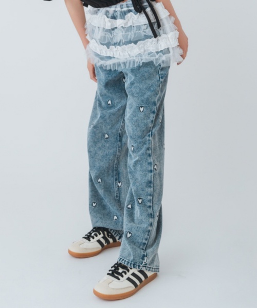 ハートの刺しゅうを全体的にあしらったパンツです。 トップスを選ばないベーシックなカラーリングで、着回しに重宝します。 ウエストにアジャスターゴムをほどこしており、お好みのフィット感に調整できるのもうれしいポイント。 刺しゅうの裏に「あて布」はございません。 【おすすめの着用時期は秋冬シーズン】 【透け感】透けない 【生地の厚さ】普通 【伸縮性】なし 【裏地】なし 【ポケット】あり 【アジャスター】あり