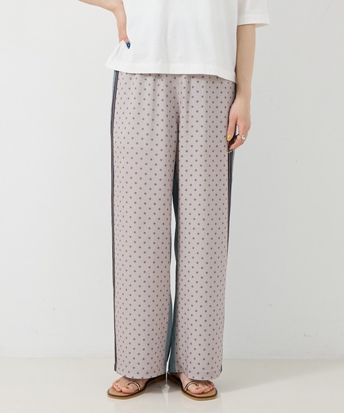 大胆プリントでコーデの主役に《POINT》程よく光沢のあるポリエステルサテン生地のストレートパンツ。おうちでの洗濯も簡単で速乾性があり、旅行にもぴったりです。しわになりにくくデイリー使いにも安心。ウエストにはゴムと共地のプリントの紐を通しているので、ウエストの調整が可能です。前後で大胆に色柄を変えたオリジナルプリントは、一見大胆ながら派手になり過ぎずコーディネートの主役に。両脇のストライプ柄もポイントです。