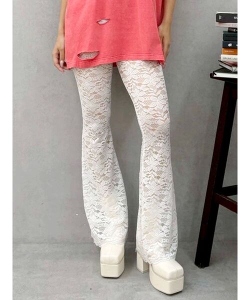 ■商品ポイント・トレンドのレースアイテム・ウエストゴム・裏地あり■商品についてトレンドのレース素材を使用したフレアパンツです。太ももの真ん中まで裏地が付いているので1枚でも安心して着用できます。伸縮性のあるレースを使用しておりウエストもゴム仕様なので着用して頂きやすくフィット感があるのでスタイルアップ効果のあるパンツです。■オススメのコーディネートTシャツやフーディーなどオーバーサイズのトップスにプラスワンがオススメ。ワンピースとのレイヤードもトレンド感が出せて◎--------------透け感:あり(裏地部分/なし)裏地:あり生地の厚み:薄め伸縮性:ありウエスト:ゴム--------------