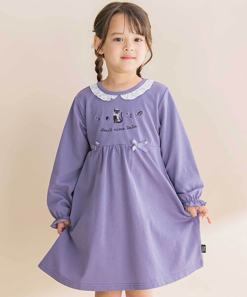 -25AW- レース襟やリボンがついて可愛い女の子用ワンピース。 ■デザイン レースフリル襟や切り替えに付いたリボンが女の子らしいアイテムです。 猫・お花・どんぐり・葉っぱの刺しゅうがアクセントになっています。 袖口はメロウ始末になってよりガーリーに。 女の子らしいピンクと大人っぽいパープルの2色展開。 ■素材/機能 しっかりとした生地感で型崩れしにくいインレイを使用。 後ろ襟がゴム仕様になって着用しやすいのも嬉しいポイントです。 ※バスト寸法は、多少の誤差が生じる事がございます。あらかじめご了承下さい。 ※100-130サイズ:脇ポケットあり。 25秋冬アイテム 【Noeil aime BeBe(ノイユ エーム べべ)】 「Daily+」 デイリープラス Life・Relax・Basicをベースにトレンドをプラスしたリラックスカジュアルブランド。 自分たちの趣味や流行を大事にしながらも、 子供との時間を大切にしたいパパ・ママに向け子供服を提案します。