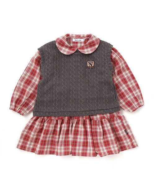 -25AW- コーデの主役となるワンピースとベストがセットになったアイテム。 ■デザイン ワンピースは色や太さが異なるタータンチェックが目を惹きます。 切り替えにはギャザーがいっぱい入って広がりのあるシルエットになっています。 ベストは編地のようなケーブル柄が特徴的です。 左胸にはロゴ刺しゅうがワンポイントに。 セットでも単品着用でもコーデに合わせて自由にどうぞ! レッド系のシャツとチャコールグレーのベストがセットになったレッド系とネイビー系のシャツとブラウンのニットがセットになったネイビー系の2色展開。 ■素材/機能 肌触りのいい生地を使用して着心地◎ ワンピースはボタンで前が広く開くから着用しやすいです。 ベストは伸びのある生地でさらにボタンがついて簡単に着用できます。 お手入れも簡単なのは嬉しいポイント。 ▼お揃い 1762-77000:シャツ・ベストセット 1767-77072:トレーナー ※柄の出方は生地の裁断により一点一点異なります。 ※100-130cm:脇ポケットあり。 25秋冬アイテム 【Noeil aime BeBe(ノイユ エーム べべ)】 「Daily+」 デイリープラス Life・Relax・Basicをベースにトレンドをプラスしたリラックスカジュアルブランド。 自分たちの趣味や流行を大事にしながらも、 子供との時間を大切にしたいパパ・ママに向け子供服を提案します。