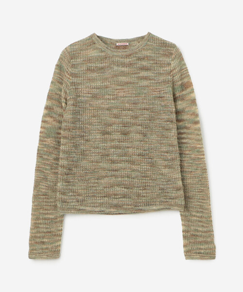 <デザイン> - クルーネックの長袖ニットプルオーバー - ショート丈 - やや透け感あり <素材> - 異なる素材を組み合わせたニット - ナチュラルなムラ感 - 鮮やかな発色 ※着用、お取り扱いの際は商品についておりますアテンションタグ、洗濯ネームを必ずご確認ください。 ※モデル撮影画像は、光の当たり具合やパソコンなどの閲覧環境によって、実際の色味と異なって見える場合がございます。商品の色味は商品単体で撮影した詳細画像をご参照ください。 メーカー品番:110012510 RYE TENDER | ライテンダー 衣類の生産過程で出番を失ってしまった原料にフォーカスを当て、その余ってしまった原料を「基点」に、原料が持つ魅力を最大限に引き出す形を探究し、ベーシックからトレンドまで趣味趣向にとらわれずに着回せる製品作りを目指している。