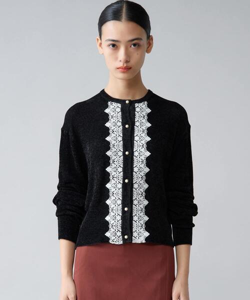 レースの前立てがアクセントになったモールヤーンのカーディガン。 ふんわりとしたベロア調の素材で程よい厚みがあり、 チクチクしないので敏感肌の方にもおすすめです。 ショート丈なのでどんなスタイルにも合わせやすく、 シンプルなコーディネートにプラスするだけで上品なスタイルに仕上がります。 モールヤーンとは糸全体に直立した毛羽がある 糸のことでベロア調の編み地を作ることができます。 肌触りが良く毛足のある高級感のあるアイテムに仕上がります。 また厚みがあり暖かく、寒い時期にもピッタリです。 ■透け感 なし ■伸縮性 あり ■光沢感 なし ■裏地 なし ■生地の厚さ 普通