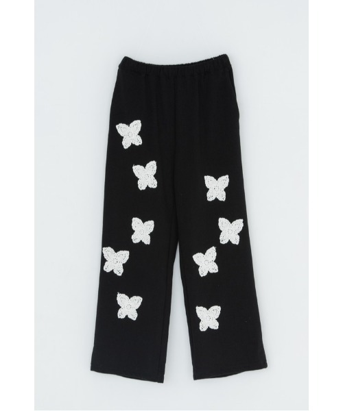 適度な保温性と?い吸?性がある しっかりとした 20/10裏?を使?したスウェットパンツ。適度なゆとりのあるシルエットと手編みで作成された蝶々モチーフのクロシェットがポイントとなったアイテム。