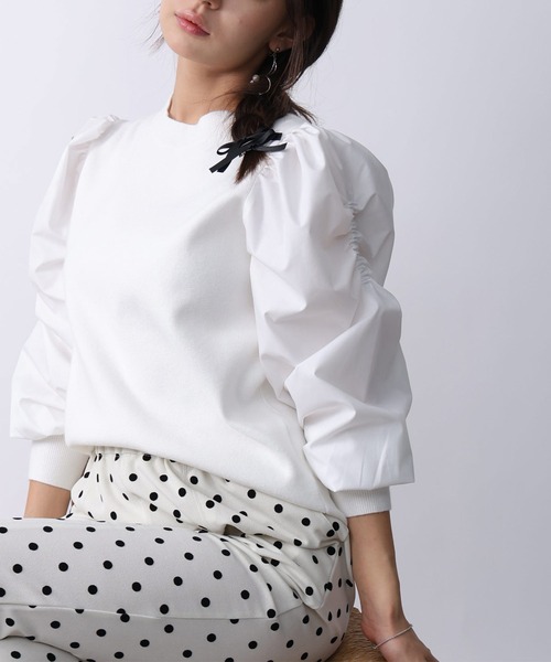 シンプルなのに、ふと目を引く袖シャーリングニット身頃は程よい厚みの12ゲージニット素材を使い、一枚でも安心感のある着心地に。肌触りはとても滑らかで、ずっと着ていたくなる優しさです。袖はコットンブレンドの布帛生地で、ほんのりハリ感をプラス。肩のギャザーと、袖に入ったゴムシャーリングが、動くたびにふわっとした立体感を生み出します。きちんと見えするクルーネックに、全体はすっきりとしたシルエット。オフホワイトとブラックの2色展開で、どちらも合わせやすく着回し力抜群。フェミニンにも、きれいめにも、大人カジュアルにもマッチし、気取らず、でも印象に残る。そんな大人スタイルの頼れるアイテムです。【詳細情報】厚み:□薄手 ■ふつう □厚手透け感: ■なし □あり(オフホワイトのみあり)光沢感: ■なし □あり伸縮性: □なし ■あり裏地: ■なし □ありポケット:■なし □あり重量: 約350g※撮影場所や明るさにより実際の商品と色味が若干異なる場合がございます。 ☆商品のお気に入り♡登録を押せば”再入荷通知”や”残りわずか通知” 値下げのお知らせが届きます!お気に入りのブランド登録していただければ新商品入荷のお知らせも届きますので是非登録してみて下さい。