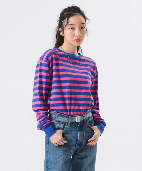 ナイスな配色に視線が釘付け! ■デザイン アメリカの古き良きウェアにインスパイアされた、どこか懐かしくも新鮮なムード漂うボーダーTシャツ。見た目は“普通”を追求しながら、ダブル付けのフライス襟やまたぎステッチ、袖口の長めリブなど、細部にしっかりとこだわりを込めた仕上がり。パキッと効いたカラーリングと絶妙なボーダーピッチが、コーディネートにアメリカンなスパイスを添えてくれます。 ■コーディネート 1枚でもインナーでも、使い勝手抜群の万能ロンT。デニムやカーゴパンツと合わせれば、気取らないカジュアルスタイルが完成。ジャケットやベストのインナーとしても映える配色で、季節の変わり目やレイヤードスタイルにも大活躍。コーディネートの幅をぐっと広げてくれる頼れる存在です。 ■サイズ ややゆとりのあるレギュラーフィットで、性別問わず取り入れやすいサイズ感。インにもアウトにも対応しやすく、どんな体型にもなじみやすいバランスです。袖リブのフィット感も良く、袖まくりなどの着こなしアレンジも楽しめます。 ■素材 40番手のコーマ糸を使用し、日本国内でオリジナル生産されたボーダー生地。度詰めで編み立てることで、適度なコシとしっかり感を持たせ、洗濯を重ねても型崩れしにくいのが特徴。日常使いにちょうどいい、安心感のある生地感です。 ■ケア方法 手洗い可(詳細は商品についている品質表示ラベルをご覧ください) Model : H164 B72 W59 H85 Size : ONE SIZE 生地の厚さ:やや薄手 透け感:なし 伸縮性:ややあり 光沢感:なし 裏地:なし 【スタッフレビュー】 スタッフ:優意 身長:155cm / 普段サイズ:M / 着用サイズ:ONE SIZE 骨格タイプ:ナチュラル サイズ感: 全体的にゆったりとしたサイズ感。 素材感: さらりとした手触りのコットン素材。 ポイント: チョコミントカラーがおすすめ!冬場はインナーにも活躍します。 ※光の当たり具合やパソコンなどの閲覧環境によって、実際の色味と異なって見える場合がございます。予めご了承ください。 ※商品の色味は商品単体で撮影した画像をご参照ください。