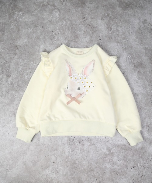 おしゃれなをバブーシュかをかぶったうさぎのプリントが、ガーリー心をくすぐる可愛さ満点のスウェット。 袖のフリルと優しい色合いが女の子らしさを引き立て、1枚でコーデが華やかに決まるアイテムです。厚すぎない裏毛は重ね着次第で体温調節もしやすいのでデイリー使いにもぴったり☆ [おすすめのコーディネート]ふんわりチュールスカートやレギンスを合わせて、甘めのガーリーコーデに♡デニムとのミックススタイルも◎で、お出かけ・お誕生日・ちょっとした撮影にも映えるアイテムです。カーディガンを羽織れば春先まで長く着回しできます◎ 同じイラストのベビーカバーオール(LP25AU005)もあるので赤ちゃんとお揃いコーデもできちゃいます☆ *80、90サイズのみ左肩にボタンがついており、脱ぎ着がしやすくなっております。 *DILのベビーサイズ商品は、全てホルマリン含有率の検査を通っておりますのでご安心下さい。 la poche biscuit(ラ・ポシェ・ビスキュイ)は、ナチュラルテイストに可愛いモチーフと、さりげなくトレンドを取り入れ、女の子に寄り添うワードローブを提案するブランド。 心躍る華やかなコーディネートが毎日をハッピーに彩ります。