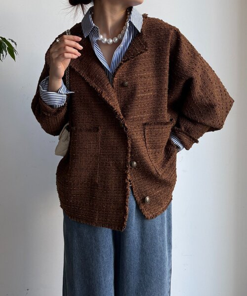 ■2025 AUTUMN & WINTER ITEM■トレンドライクながらも品の良さをプラスおしゃれさがぐっと上がるツイードジャケット。カジュアルにも着崩せるよう、程よくオーバーなサイジングで仕上げました。ノーカラーのデザインがお顔周りをすっきりとみせてくれ、ゴールドのボタンがクラシックなポイントに。いつものスタイルに羽織るだけで、一味違う雰囲気へと導いてくれるので様々なシーンで活躍すること間違いなし。- POINT -・トレンドライクなツイード素材・おしゃれさがぐっとup!・カジュアルにも着崩せるルーズなサイジング--------------------------------洗濯:水洗い不可透け感: なし裏地: あり伸縮性: なし光沢感: なし--------------------------------【 ♡ をクリックでお得な情報をお知らせいたします 】〈 商品のお気に入り登録 〉 お気に入りアイテムのお値下げ・再入荷・在庫ラスト1点など通知を受けることができます。〈 ブランドのお気に入り登録 〉DOUDOUの新商品や再入荷、セール、クーポン配布などお得な情報を受けることができます。--------------------------------------※ 生産の都合上、お届け時期が前後する場合がございます。※ 掲載画像の商品の色味は、 撮影場所や光の当たり具合などにより色味が異なって見える場合がございます。 また、お客様のお使いのPC・スマートフォン等のモニター環境などにより色味が異なって見える場合がございます。予めご了承の上ご注文ください。 ※ 着用、お取り扱いの際は、商品についている品質表示とアテンションタグを必ずご確認下さい。