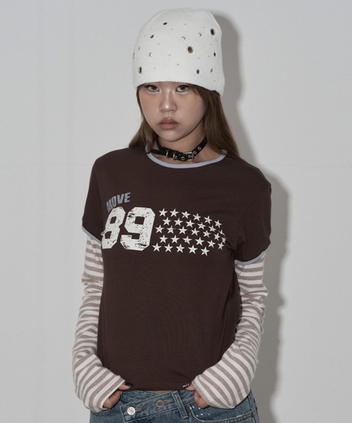 A'GEM/9 × .kom 『MIDNIGHT MOVE/ミッドナイトムーブ』star 89 long sleeve/スター ナンバリングデザイン フェイクレイヤード ボーダー長袖Tシャツ