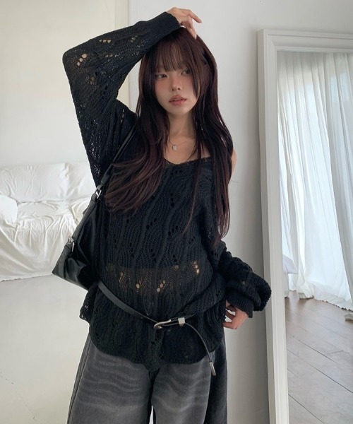 ▼Item Point透かし編みのメッシュニット 深めのVネックデザイン オフショルダー演出可 ルーズフィット ミディアム丈 長めの袖丈 ▼Item Infomation 伸縮性:あり 季節:春 秋 透け感:あり 裏地:なし ※±1~3cmの誤差が出る場合がございます。 ▼Washing Tip ドライクリーニング推奨。 高温に弱く、縮みや型崩れの原因となります。 洗濯時に色落ちや生地の変形が生じる場合があります。 漂白剤、乾燥機のご使用はお避けください。 anyonemore | エニワンモア #モノトーン#ガーリー#Y2K#バレエコア anyonemoreは、ベーシックでミニマルなアイテムに 最新のトレンドを反映させたユニークなデザインのアイテ ムがお手頃価格で揃う韓国発のファッションブランド。ブ ランド名のとおり他の誰よりも自分らしく、一人一人の魅 力をさらに一段階アップさせてくれるアイテムがZ世代を 中心に人気を集めている。
