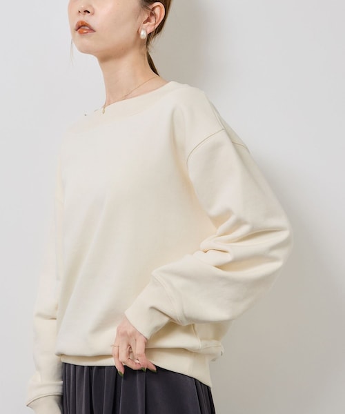 【素材感】 ・ボディは綿の柔らかさとポリエステルの扱いやすさを両立し、リブは綿100%で優しいフィット感を実現。 ・デイリー使いにぴったりのスウェット素材。 【デザイン・シルエット】 ・横に広く浅く開いたボートネックが、カジュアルなスウェットに女性らしい上品な印象をプラス。 ・片方の肩を少し落としたワンショルダーの着こなしも可能。 ・トレンド感と華奢見えを両立する愛らしいボリュームスリーブ。 ・手首はリブ仕様でボリュームスリーブとの対比が、全体の引き締めと動きやすさを両立。 ・バックネックに付属のゴールドのプレートもカジュアルになり過ぎないデザインポイント。 ・同素材でDOGウェア(品番:GID65050)も展開。 【カラー】 ・ブラック、ライトグレー、キナリの3色展開。 【スタイリングポイント】 ・パンプス×パンツと合わせるとカジュアルな中にも抜け感あるスタイリングに。 ・レース素材やIラインスカートなど素材やシルエットで女性らしさを出すボトムも◎。 ・スラックスに、ワンショルダーの着こなしは大人カジュアル感が出ておすすめ。 ----------------------------- 裏地:なし 光沢感:なし 透け感:なし 伸縮性:あり ボタン:なし 生地の厚さ:厚手 季節:春、秋、冬 ----------------------------- ※撮影時の光、お使いのモニター環境によって色の見え方が違う場合がございます。 【モデル着用サイズ】 身長:165cm 着用サイズ:F