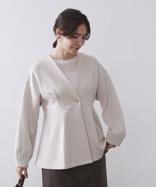 スウェットライクななめらか素材で着心地◎ジャケットのようにさらりと羽織れるカーディガン【デザイン】・なめらかな表面感と程よいふくらみのある、ダンボール素材を使用したジャケットライクなカーディガン。・すっきりとしたノーカラーとウエストで切り替えられたさりげないペプラムシルエットで、さらりと着られつつスタイルアップが叶います。・肩はややドロップショルダーになっており、リラクシーに着られこなれ感を演出。・一つボタンは波打ちのあるゴールド釦でアクセントに。・快適に楽しめる、大人のダンボールプルオーバーです。【素材】・ほどよい厚みと膨らみ、ハリ感のバランスが特徴のダンボール素材を使用。・ハリがありつつも柔らかく、その肌触りの良さも魅力です。・マシンウォッシャブル、UVケア機能付き。※この製品は、太陽光線中の紫外線(UV)を通しにくくします。この効果は永久的ではありません。※照明の関係により、実際よりも色味が違って見える場合があります。また、パソコン・スマートフォンなどの環境により、若干製品と画像のカラーが異なる場合もございます。モデル情報:身長165cm B72 W57 H84 着用サイズ:38(M)店舗へのお問い合わせ商品番号:637-34200●製品寸法:38(M):着丈62cm B96cm 袖丈46cm 肩幅55cm40(L):着丈63cm B99cm 袖丈47cm 肩幅56cm42(LL):着丈65cm B102cm 袖丈48cm 肩幅57cm備考: