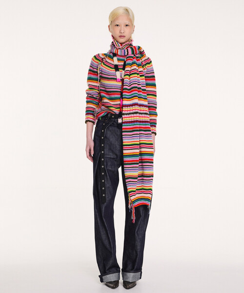 <デザイン> - マルチカラーのボーダーニットマフラー - サイドにフリンジデザイン - ピッチが異なるボーダー柄 <素材> - LA FETICHE過去シーズンの余剰糸を使用 - 柔らかで肌触りの良いラムウール ※着用、お取り扱いの際は商品についておりますアテンションタグ、洗濯ネームを必ずご確認ください。 ※モデル撮影画像は、光の当たり具合やパソコンなどの閲覧環境によって、実際の色味と異なって見える場合がございます。商品の色味は商品単体で撮影した詳細画像をご参照ください。 メーカー品番:LINA LA FETICHE | ラ フェティッシュ 2017年に設立されたブランド。フレンチシックとブリティッシュエキセントリックを融合させたデザインをコンセプトに、伝統的な生地・職人の技術にこだわり、時代に流されないクラシックなアイテムを提案しています。