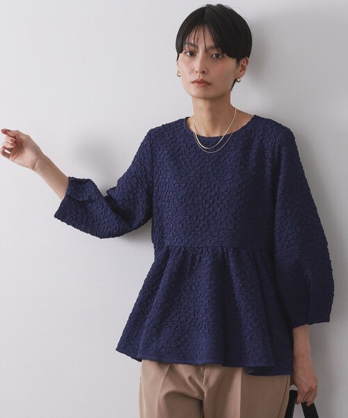 凹凸のあるふくれジャカード素材を使用 ペプラムシルエットが華やかなプルオーバーブラウス 【デザイン】 ・ペプラムシルエットが程よい華やぎ感を与えるデザインブラウス。 ・ひじ下に切替を入れたランタンスリーブで、手首に華やかなボリューム感をプラス。 ・少しだけ前後差をつけた丈感で、バランスよく着こなせるデザインです。 ・首の後ろにボタンがあり、外して着脱する仕様になります。 【素材】 ・ぽこぽこと凹凸のある、ふくれジャカード素材を使用。 ・マシンウォッシャブルでお手入れも簡単です。 ※照明の関係により、実際よりも色味が違って見える場合があります。また、パソコン・スマートフォンなどの環境により、若干製品と画像のカラーが異なる場合もございます。 モデル情報:身長163cm B82 W62 H91 着用サイズ:38(M) 店舗へのお問い合わせ商品番号:637-84030 ●製品寸法: 38(M):着丈60cm B92cm 袖丈45cm 肩幅35cm 40(L):着丈62cm B96cm 袖丈46cm 肩幅35cm 42(LL):着丈64cm B100cm 袖丈47cm 肩幅36cm 備考: