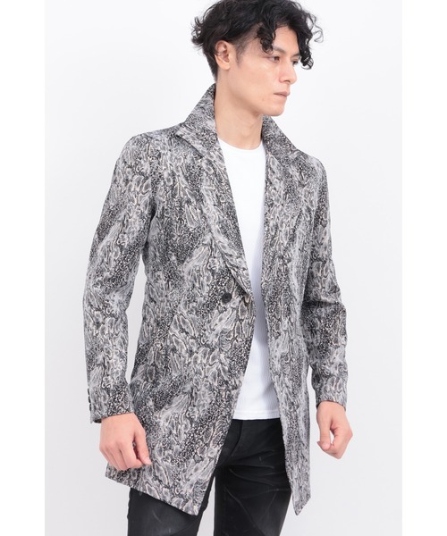 [DESIGN]イタリア・MONTEOLIVETO社製のアニマルジャカードを贅沢に使用した、セミダブル仕立ての返し衿コート。鈍い光沢が表情に奥行きを与え、動くたびに生地の陰影が浮かび上がります。その質感に呼応するように、シャープで立体的なシルエットを追求。程よく構築的なセミダブルの前立てと、優雅に返る衿周りが、クラシックなムードとモードなエッジを融合させています。仕立ての軽やかさとロング丈の重厚感を併せ持ち、羽織るだけでスタイリングを引き締める主役級のアウター。テクスチャーとカッティングが共鳴する、ラグジュアリーかつアーティスティックな一着です。[TEXTILE]イタリア・プラトー地区に拠点を構える老舗生地メーカー、MONTEOLIVETOによるアニマルジャカード。天然素材や合繊の先染めに秀でた技術を活かし、多色の先染め糸とラメ糸を巧みに織り上げた、変形パイソン柄のテキスタイルです。繊細な織りによって生まれる立体的な表情と、見る角度によって鈍く輝く控えめな光沢感が絶妙なバランスで共存。ワイルドさの中にエレガンスを内包し、モードな存在感を放ちます。