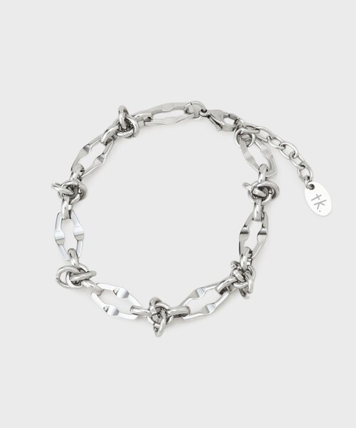 【素材】ステンレス鋼【デザイン】「複雑なチェーン」という意味の「Elaborate Chain(エボラレイトチェーン)」デザイン。変形のダイヤパーツと丸カンが複雑に組み合わせられた凝ったチェーンのブレスレット。「水や傷に強く、変色がしづらい」のが特徴のステンレス素材を使用しています。程よいストリートモード感漂うデザインがスタイリングのアクセントに。3cmのアジャスターチェーン付きで17.5~20.5cmまで調整可能なので、手首に「ぴったり」も「ゆるめ」にも着用ができ、好みに合わせて調整が可能。また、シャツやカットソーなどの洋服の上からも付ける際にも便利です。<長さ>17.5~20.5cmまで調整可能留め金(カニカン)先端~アジャスターチェーン端 55cm(tkロゴ入りプレート抜き)アジャスターチェーン 5cmロゴの入った巾着付きでギフト/プレゼントにもオススメです。- BRAND CONCEPT -時代を超えて支持されるトラディショナルなアイテムをベースに、アソビ心とストリートの自由な発想を取り入れ、日本独自のミックススタイルを提案します。【気になる商品はお気に入り登録をおススメ】▼商品のお気に入り登録完売しているカラーの再入荷通知や、ラスト1点、セールの通知をお知らせいたします。▼ブランドのお気に入り登録新商品や再入荷など、いち早くブランドの情報を受け取ることができます。※照明の関係により、実際よりも色味が違って見える場合があります。また、パソコン・スマートフォンなどの環境により、若干製品と画像のカラーが異なる場合もございます。店舗へのお問い合わせ商品番号:979-04803●製品寸法:00:全長17cm 幅1cm備考: