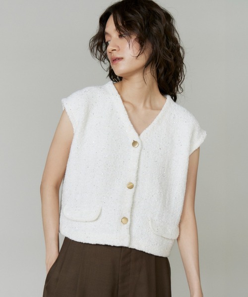 ■デザインキラキラと光るスパンコールと様々な糸を使い編み立てられた柄が上品で華やかな印象のツイード風ニットジレ。肩周りはしっかりと包み込みつつもコンパクトなサイズ感で、シャツやカットソーなどとのレイヤードはもちろん、ノースリーブのトップス感覚で着こなすのもおすすめです。ゴールド釦がエレガントな印象で、コーディネートに華やかさをもたらしてくれる主役級アイテムです。■素材4種類の糸で編み立てられたツイード風素材。フラッグヤーンの光沢感とスパンコール糸で華やかな印象を、モコモコとした質感のブークレ調の糸で季節感を表現しました。フィラメントの糸で柄に横方向のアクセントを持たせ、よりツイード風に見えるよう表面感を持たせました。・水洗い可同素材のカーディガン品番:7154178040■サンプル撮影商品画像の商品はサンプルです。実際の商品とはサイズや色味、素材、デザイン等の仕様が若干変更になる場合がございます。