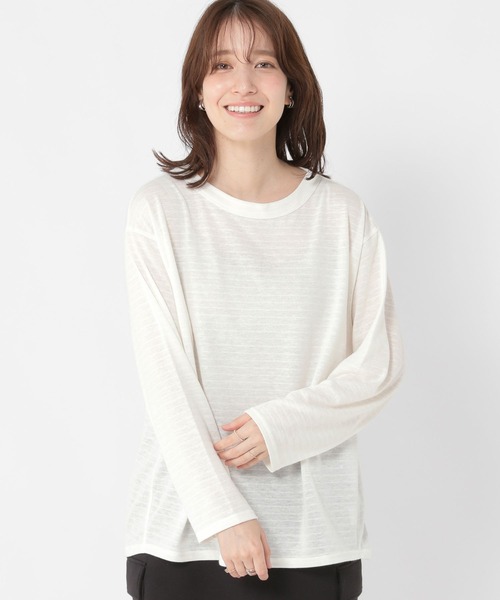 着心地の良い柔らかな一枚やや大き目でゆったりとしたサイズ感のロングスリーブTシャツーーー【素材】リネン混のスラブ感が特徴的な素材を使用。表面はさらさらとしたドライタッチで薄すぎず、厚すぎない着心地の良い素材感です。無地はボーダーと同じように、糸の混率が違う糸をボーダー柄と同じように編んでいるので、シャドーボーダーのような見え方になっています。【デザイン】身体離れしたやや大きめシルエットのロングスリーブTシャツ。後ろのヘムラインを少しだけラウンドさせ、長めのデザインに。襟はすっきりとしたクルーネックで、レイヤードもしやすい襟の空き具合もポイントです。トップス インナー カットソー ボーダー ロンTーーー【スタイリング】ゆったりとしたシルエットなので、カジュアルボトムと合わせたリラックス感のあるスタイリングがおすすめ。布帛のブラウスやニットのインナーにもお使いいただけます。