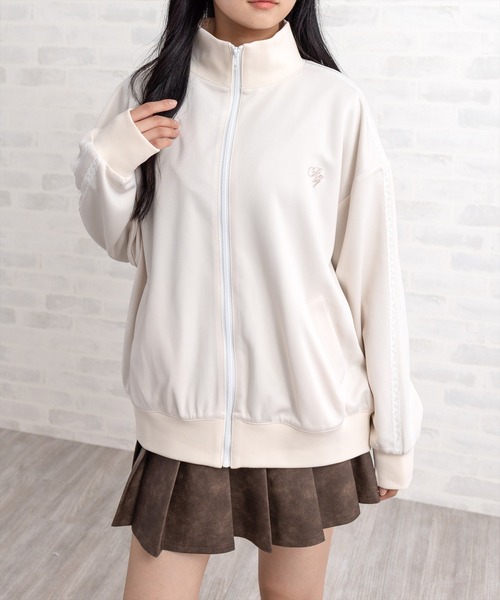 甘さをひとさじ加えたスポーティーアウター!レースサイドライントラックジャケット【デザイン】スポーティーなジップアップデザインに、サイドにレースを施すことで女性らしさを加えた一枚。シンプルなフォルムながらも、ディテールのさりげない可愛さが全体を引き立てます。カジュアルからフェミニンまで幅広いスタイリングに活躍できるアイテムです。【素材感】着心地の軽いポリエステル素材伸縮性:あり/ 透け感:なし/ 裏地:なし 手洗いによる洗濯可 / ドライ・ウェットクリーニング可【コーディネート】ワイドパンツと合わせればストリート感を残しつつ、レースがほんのりフェミニンな雰囲気を演出。スカートを合わせれば、甘さとラフさのバランスが取れたスタイルに仕上がります!デイリーにはスニーカーを合わせた抜け感のあるカジュアルコーデがおすすめですがショートブーツと合わせれば少し大人っぽい印象にチェンジ。シンプルながらもレースのアクセントがあることで、いつものコーデがぐっと華やかに◎【※お取り扱い上のご注意】1:モニター環境等により実際の商品と多少色味が異なって表示される場合がございます。予めご了承下さい。2:屋外で撮影された商品は、天候により多少実際のカラーと異なる場合があります。商品のカラーはトルソー(マネキン)の商品画像をご参照ください。3:濃い色の商品は、お洗濯や摩擦等による移染にご注意ください。4:末永くご愛用頂く為に、アテンションタグ・洗濯ネームを必ずご確認の上、着用又はお取り扱い下さい。5:生産時期により、色、サイズ、デザイン、素材の質感が多少が異なる場合がございます。あらかじめ御了承下さいませ。