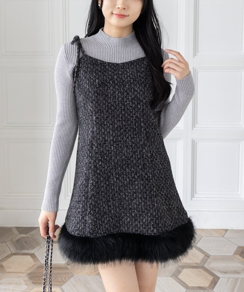 大人レディなシルエット!ファーツイードミニキャミワンピース【デザイン】上品なツイード素材を使用したキャミワンピース。裾にはふわりとしたフェイクファーをあしらい、シンプルながらも華やかな印象を与えます。ウエストラインを少しくびれるように設計されており、女性らしいシルエットを際立たせるのがポイント。肩紐はリボンで調整可能で、可愛らしさと実用性を兼ね備えています。【素材感】着心地の軽いポリエステル素材伸縮性:なし/ 透け感:なし/ 裏地:あり 水洗いによる洗濯不可 / ドライクリーニング可【コーディネート】一枚でドレスライクに着こなせば、パーティーや特別なシーンにぴったり♪インナーにタートルネックやシアートップスをレイヤードすれば、普段使いにも◎ショートブーツやヒールを合わせればよりエレガントに、ロングブーツでトレンド感あるスタイルに仕上がります!1枚で存在感あるアイテムなので、デートや参戦服など特別な日の1着としておすすめです♡【※お取り扱い上のご注意】1:モニター環境等により実際の商品と多少色味が異なって表示される場合がございます。予めご了承下さい。2:屋外で撮影された商品は、天候により多少実際のカラーと異なる場合があります。商品のカラーはトルソー(マネキン)の商品画像をご参照ください。3:濃い色の商品は、お洗濯や摩擦等による移染にご注意ください。4:末永くご愛用頂く為に、アテンションタグ・洗濯ネームを必ずご確認の上、着用又はお取り扱い下さい。5:生産時期により、色、サイズ、デザイン、素材の質感が多少が異なる場合がございます。あらかじめ御了承下さいませ。