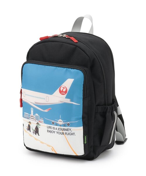 空港の風景と恐竜の機長と副操縦士を描いたリュックです。JALの機体をイメージしたイラストと、駐機場の景色を大胆にプリント。背中側のファスナーの開閉でマチを拡張でき、たっぷりと収納できます。Tシャツ(品番:5353254)と同じデザインで、セットで合わせるのもおすすめです。内側にお名前を記入できるタグがついています。
