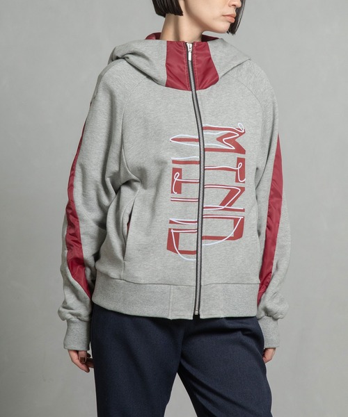 ■2025 AUTUMN WINTER collection■手書きロゴをフロントにプリントしたフーディ裏毛にナイロンツイルをコンビネーションしたアイテム大胆な「MIND(マインド)」ロゴが印象的なフーディ。配色の切り替えやフード裏のカラーアクセントが、ストリート感のあるデザインに奥行きを与えます。ゆったりとしたシルエットで着心地も抜群。アウターとしてはもちろん、トップスとしてもスタイリングの主役になる存在感のある一枚です。【DESIGN】■日々移り変わるMIND(マインド)をオープン/クローズするイメージをデザイン■大きめのフードは表裏で異素材配色■ファスナーを完全に閉めるとスタンドカラー■フロントはラグラン、バックはセットインスリーブで前後で表情が変化■2種の配色ロゴを重ねて上下にずらし、ラフなテイストをプラス■前振りにした後身頃との切替え線上両端にシームポケットあり■羽織りアイテムとしてだけではなく、トップスとしてサマになるアイテム【MATERIAL】(表地)ナチュラルな風合いが心地いい裏毛を使用・タオルのようにパイル状に編むことで空気を含み、快適な着心地の素材・適度な保温性と高い吸水性があり、蒸れにくいのが特徴(別地)発色が良く、軽くて丈夫な綾目のナイロンツイルを使用・撥水機能を備えた素材・マットで程よい光沢があり、存在感のある印象(別地:テレコ)ストレッチ性に富んでおり、希少価値の高い編み機で編み立てしているベアテレコを使用・しっかりとした編地と肌触りの良さが特徴--------------------------裏地:なし光沢感:部分的にあり透け感:なし伸縮性:あり生地の厚さ:中肉厚ケア方法:ホームクリーニング(手洗い)--------------------------◆お取り扱いについては商品についております品質表示にてご確認下さい。*光のあたり具合いやパソコンなどのモニター環境によって実際の色味と異なって見える場合がございます。予めご了承ください。*撮影時はサンプルの為、若干のデザイン変更等ある場合がございます。予めご了承ください。<INFORMATION>◆商品のお気に入り登録お気に入り登録していただいた商品は、完売商品の再入荷通知やラスト1点の通知、またクーポン発行やタイムセールの通知もお届け!ぜひご登録してください。◆ショップ・ブランドのお気に入り登録新商品や再入荷、ショップ・ブランドのお得な情報をいち早お届け!ぜひご登録してください。