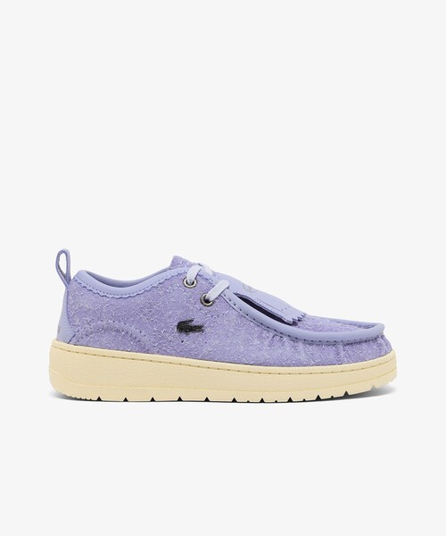 クラシカルな気品にレクスチャーとカラーリングで遊び心を添えたレディースレザーシューズ ・テクスチャーが際立つ長起毛のスエードアッパー ・クラシカルなモカシンステッチと、洒落感あふれる履き入れ口の飾り切り ・着こなしの幅を広げる着脱可能なレザーフリンジパネル ・サイドにアーカイブルックのメタリックワニロゴを配置