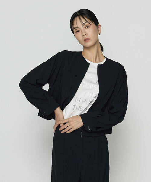 《デザイン》この時期にぴったりなノーカラーブルゾンです。味のあるヴィンテージサテンで、あえてワークディテールである大きめのパッチポケットやリベットによるアクセント等を取り入れた大人の一着です。後中心に配置したタックや裾ベルトもポイントです。裾のタブ+釦でサイズ調整も可能です。前を開けてTシャツの上にさらりと羽織って、同時期に入るドライシャンブレーのプリーツスカート(商品番号:15-03FM04-205)に合わせてお楽しみください。また同素材のパンツ(商品番号:15-04PM08-205)とセットで合わせても素敵です。《素材》トリアセテート100%を高密度で織り上げた贅沢な素材です。トリアセテートならではのしなやかさと上品なきしみ感を存分に感じられます。ハリコシがありつつも、落ち着き感があるので程良い抜け感を生み出します。さらっとしたドライなタッチなので暑い時期にも快適に着られます。黒一色展開ですが重くなり過ぎないように真っ黒にしすぎずヴィンテージ感のある色にしています。