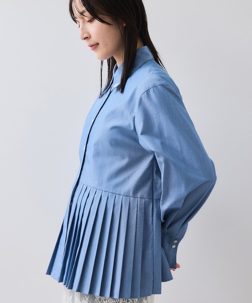 裾プリーツイのレギュラー切替シャープで洗練された印象のシャツ◆2025秋冬◆<POINT>・程よい張り感のシャツ地で着まわしやすい。・裾のプリーツがスタイリングに動きを持たせます。・エンブレム刺繍がポイント!・嬉しいマシンウォッシャブル。【デザイン・シルエット】イレギュラー切替で裾はプリーツデザイン。ベーシックな襟付きシャツですが、裾ポイントを持たせることでスタイリングの幅が広がります。袖口の長めのカフスは折り返して着用することができます。羽織としても着用いただけるようなサイズ設定に。襟先の刺繍もアクセント。【素材】程よい厚みと張り感のあるシャツ地。洗濯機洗い可能。【カラー】ホワイト、ブルー、ピンクの3色展開。※それぞれ襟先に刺繍ありホワイト(10):ネイビー刺繍ブルー(44):ホワイト刺繍ピンク(63):グレー刺繍【おすすめのスタイリング】カーディガンやプルオーバーなどニットのアイテムをレイヤードして裾と襟を出してポイントを見せるのがおすすめです!もちろん1枚着としても◎-----------------------------裏地:なし光沢感:なし透け感:ややあり伸縮性:なしポケット:なしボタン:あり(開閉可)生地の厚さ:やや薄手季節:春、夏、秋-----------------------------【モデル着用サイズ】モデル身長:161cm 着用サイズ:F※画像の商品はサンプルです。 実際の商品と仕様、加工、サイズが若干異なる場合がございます。※画像によっては実際の色味と異なる場合があります。正しい色味は生地アップ画像をご確認ください。