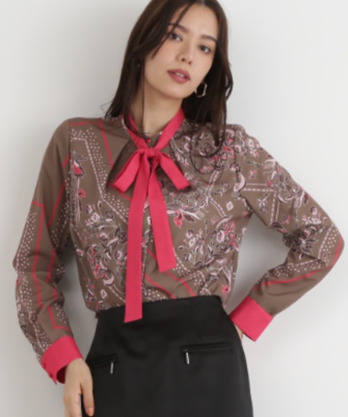 クラシカルなフローラルスカーフ柄が目を惹く、エレガントなブラウススタンドカラーがきちんと感を演出し、襟元から流れるタックドレープが顔まわりを華やかに彩ります。襟のリボンと袖口カフスにはカラー切り替えを施し、さりげないアクセントをプラス。シンプルなボトムスと合わせるだけで、コーディネート全体をクラシカルで上品な印象に仕上げてくれる主役級の一着です。 【素材説明】 ソフトなドレープ性と軽やかな風合いが特徴で、上品な光沢感がクラシカルな印象を引き立てるアンティークデシンを下地に、抽象的な模様やフローラル、幾何学的なパターンを組み合わせたスカーフ柄をプリントしました。 【商品特性】 ストレッチ性なし/前ボタンあき/ネックリボンは取り外し可◆お買い物をよりお楽しみいただくために◆・「商品のお気に入り登録」で完売カラーの再入荷やラスト1点、セール通知を受け取ことができます。・「ブランドのお気に入り登録」で新商品の入荷情報など、いち早く受け取ることができます。