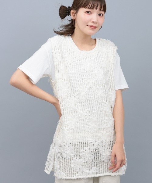 こなれたレイヤードコーデが楽しめるレースベスト ■デザイン ざっくりと編まれたメッシュの中に、お花が散りばめられた1枚。 カジュアルながらもどこか女性らしさを感じるデザインになっています。 前後差のある丈感で、さりげなく体型カバーを叶えてくれるのが嬉しいポイント。 ■サイズ感 レディースフリーサイズ 程よくゆったりとした、リラックス感のある着心地。 ■素材感 さらりとドライタッチの繊細なレース素材。 ■スタイリング シンプルなTシャツと合わせて、カジュアルなコーデにオススメ。 季節に合わせてタンクトップや、長袖Tシャツと合わせてロングシーズン着回せます。 ■カラー ブラック/ホワイト ■お手入れ 手洗い --------------------------------- 透け感:透ける 伸縮性:あり 裏地 :なし 光沢 :なし 生地の厚さ:普通 ポケット:なし --------------------------------- 【TITICACAのお買いものをお楽しみいただくために!】 ▼商品のお気に入り登録 完売カラーの再入荷通知や、ラスト1点の通知、セールの通知も受け取ることができます。 ▼ブランドのお気に入り登録 新商品や再入荷など、いち早くブランドのお得な情報を受けることができます!