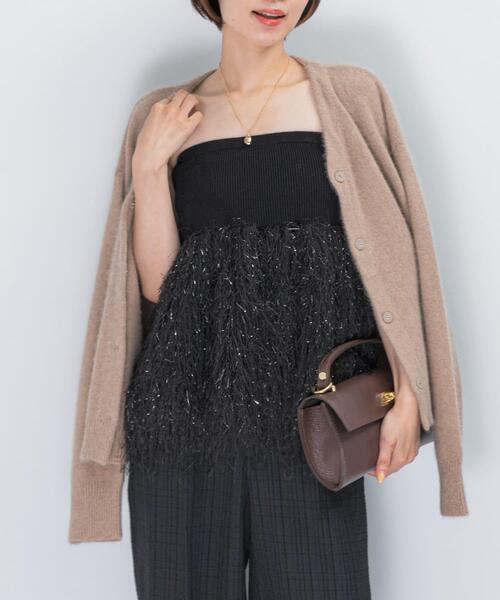 【フェザーフリンジが主役級の華やぎをプラスする、大人のニットビスチェ】 華やかなフリンジが視線を集めるニットビスチェ。ニット素材とラメが繊細にきらめくフリンジ素材がドッキングされた、表情豊かな一枚です。いつものシンプルな装いにプラスワンするだけで、コーディネートをぐっと華やかに格上げしてくれます。ニット部分にはゴムを施し、ストレスフリーな着用感を実現。ベアキャミソールとしても楽しめる2WAY仕様なのも魅力的な一着です。 【2025 Autumn/Winter】【25AW】 ※この商品は、素材の特性上ピリング(毛玉)ができやすいので、連続着用はお避けください。毛玉ができた場合は、毛玉取り器やハサミなどでお手入れください。 総重量 : 約255g ※商品画像は、光の当たり具合やパソコンなどの閲覧環境により、実際の色味と異なって見える場合がございます。予めご了承ください。 ※商品の色味の目安は、商品単体の画像をご参照ください。 ▼お気に入り登録のおすすめ▼ お気に入り登録商品は、マイページにて現在の価格情報や在庫状況の確認が可能です。 お買い物リストの管理に是非ご利用ください。 素材感 透け感 : ややあり(OFF WHITE) 伸縮性 : ややあり(ニット部分) 裏地 : なし 光沢 : なし ポケット : なし OFF WHITE:166cm(FREE) BLACK:158cm(FREE) / 166cm(FREE) FREE