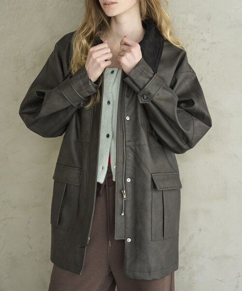 2025 Fall & Winter item去年の人気モデルがアップデート。表情豊かなクラッシュレザーブルゾン●衿にコーデュロイ素材を採用し、さりげなく上品なアクセントをプラス●ヴィンテージ感のある風合いを表現した合皮素材●ヒップまで隠れるやや長めの丈で、バランスの良いシルエット●ゆとりのあるサイズ感で、厚手ニットも重ねやすい設計●秋は軽やかに1枚で、冬はインナーダウンを合わせてシーズンを通して活躍●袖口はタブ付きでフィット感の調整が可能●衿タブを留めればスタンドカラーにもなる2WAY仕様●シーンに合わせて印象を変えられる汎用性の高い一着おすすめコーディネートクラッシュ感のあるフェイクレザーブルゾンは、シンプルなニットやスウェットに羽織るだけでこなれ感を演出。秋はカットソーとデニムでラフに、冬は厚手ニットやインナーダウンを重ねて保温性を高めるのもおすすめです。ボトムはワイドパンツやカーゴパンツを合わせると旬なストリート感が出せ、スラックスと合わせれば大人カジュアルな雰囲気に。スタンドカラーにすればアウターライクに、衿を寝かせればリラックス感ある着こなしが楽しめます。※重量(Sサイズ):950g※掲載画像の商品の色味は、屋外や屋内の光の照射や角度により実物と色味が異なる場合がございます。また表示のサイズ感と実物は若干異なる場合もございますので、予めご了承ください。※着用、お取り扱いの際は、商品についている品質表示とアテンションタグを必ずご確認下さい。【Firsthand / ファーストハンド】Fashion , Sustainable , Art をテーマに、デザイン性やクォリティー、モノ作りなど、クリエイティブを重視したサステナブルなコンセプトストア。 ここでしか出会えないブランドやアイテム、ここでしかできない実体験、新しくスタイリッシュなカルチャーとファッションをここから発信していきます。フリークスストア等を構えるデイトナインターナショナルから新たに発信されるブランドです。