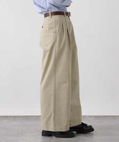 オンオフ兼用で着回しが楽しめる一着美脚シルエットで魅せるタックチノパンツーーー【素材】綿100%素材を使用。程よいハリ感と柔らかさで履き心地のいいアイテムです。【デザイン】オフィスやオケージョンなどオンオフ兼用で使えるタックチノパンツ。程よいストレートシルエットで身体のラインもカバーしてくれる一着です。また、タックから続くセンターラインが脚長で美脚効果のあるデザインに仕上げました。上品な印象のベージュとカジュアルになり過ぎない柔らかいカーキの2色展開でご用意しております。ーーー【スタイリング】カットソーやシャツなど幅広いトップスと合わせやすく、大人なハンサムスタイルにぴったりなアイテムです。