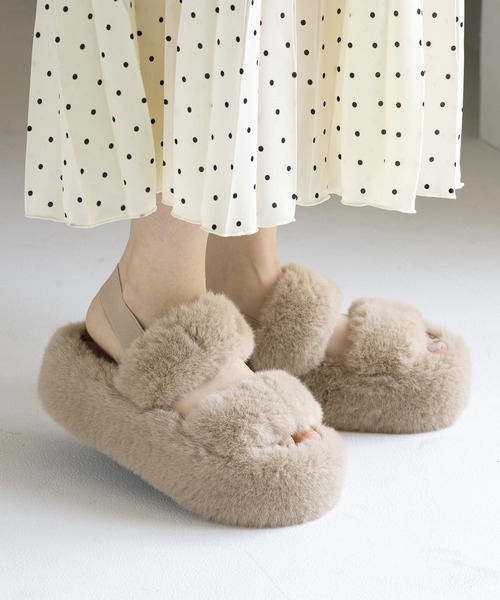 フワフワで存在感のあるボリューミーなファーを使用したダブルストラップデザインのサンダル。ソールまでファーなので足を包み込むフワフワで柔らかな履き心地は、やみつきになること間違いなし! シーズンムードを高めてくれる主役級アイテムです。 程よい厚みのソールでスタイルアップ効果も◎ 屋外ではもちろん、寒い季節の室内履きとしてもオススメのサンダルです。 ※撮影は室内で行われており、ライティングにより実物と色味が少し異なる場合がございます。