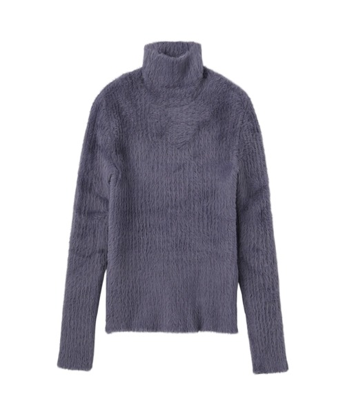 ミドルゲージでフィット感のあるリブハイネックシャギーニットセーター。ナイロン特有の柔らかく肌触りの良さが特徴の、イタリアPINORI社のミドルフェザーヤーンを使用。約1cmの適度な毛足の長さのミドルゲージに対応した糸で、季節に関係なく着用可能な素材。