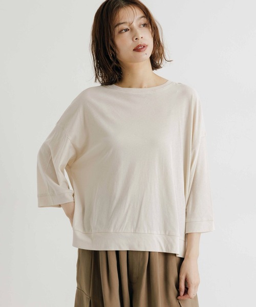 シンプルで着回しの効く一枚 秋のスタイリングにおすすめな7分袖プルオーバー ーーー 【素材】 透け感のある薄手の強撚天竺を使用。 今の時期から着用できる薄くて軽い素材感です。 【デザイン】 シンプルなシルエットの7分袖プルオーバー。 着回しの効くデザインなので、秋のワードローブに欠かせない一枚です。 さらっと一枚ではもちろん、レイヤードスタイルのインナーにもおすすめ。 トップス カットソー 長袖 ーーー 【スタイリング】 さらりと一枚ではもちろん、シャツやブラウス、ベストのインナーとしてもお使いいただけます。 ジャンパースカートやキャミワンピース、ジャケットのインにもおすすめです。