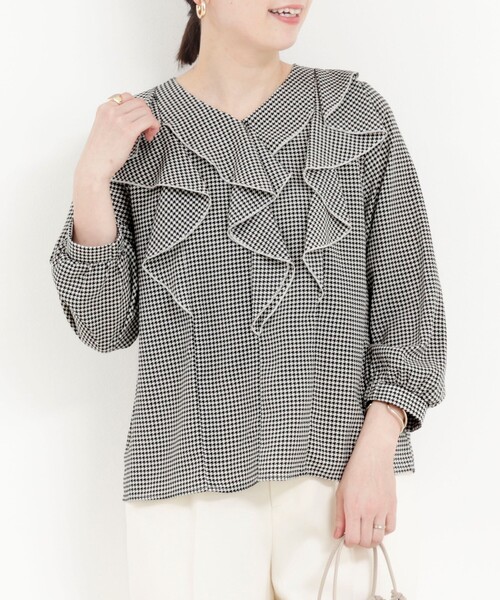 ◇25AW◇MICO COULIERコーデに華やぎをプラスするフリルブラウス◆Point・さらりとした上品なジョーゼット素材のブラウス・フロントのラッフルフリルが顔まわりを華やかに演出・Vネックで首元すっきり・手首の見える8分袖、袖口は内側ゴム仕様で袖をまくって留まるデザイン・後ろは涙あき+パール調ボタンでクラシカルなアクセント・シワになりにくくシーズンレスに着られる万能ブラウス<同生地シリーズ>ジョーゼットティアードブラウス(5-0807-5-01-003)----------------------------------------------------------透け感:ライトグレー:ややあり、ホワイト系その他・モカ:若干あり、ネイビー:なし裏地:なし伸縮性:若干あり光沢感:ムジのみ若干あり洗濯:手洗い可----------------------------------------------------------気になる商品は、お気に入り登録がオススメです!クーポン情報、入荷情報が通知されるようになります----------------------------------------------------------●お取扱い上のご注意● 末永くご愛用頂くために、アテンションタグを必ずご確認の上、着用又はお取り扱い下さい。※店頭及び屋外での撮影画像は、光の当たり具合で色味が違って見える場合があります。商品の色味は、スタジオ撮影の画像をご参照下さい。※商品画像に関しては出来る限り忠実に表示出来るよう努めておりますが、お客様がご利用のモニターの設定及び特性により、実際の商品と比較し色味に若干の誤差が生じる場合があります。※製品洗い加工の商品は、多少の歪み、シワなどが見られたり、風合いやサイズ等が1枚1枚異なります。汗や雨等で濡れた時や、摩擦により色落ちし、他の衣料を汚すことがありますので(特に濃色のもの)ご注意ください。