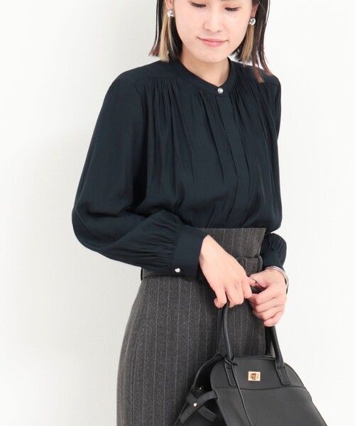 ◇25AW◇MICO COULIER1枚で着ても華やか。ジャケットインにも映えるきれいめ万能ブラウス◆Point・上品な光沢感としなやかな落ち感が特徴のパウダーサテン素材を使用・すっきり見えるノーカラーに一番上のボタンだけを見せた比翼デザインが洗練された印象・控えめな艶が上品な丸みのあるメタルボタンもポイント・前後・袖口に入ったギャザーのドレープ感が華やか・タックインしなくてもきれいに決まる丈感・きれいめなパンツやスカートを合わせればオフィスシーンやセレモニーに、デニムに合わせれば大人カジュアルに楽しめるコーディネートの幅が広がる1枚・合繊素材&スタンダードな長袖でシーズンレスに着回せる・シワになりにくく手洗い可能なイージケア素材でデイリーに活躍----------------------------------------------------------透け感:ミント:若干あり、グレイッシュベージュ:ややありネイビー:なし裏地:なし伸縮性:なし光沢感:ややあり洗濯:手洗い可----------------------------------------------------------気になる商品は、お気に入り登録がオススメです!クーポン情報、入荷情報が通知されるようになります----------------------------------------------------------●お取扱い上のご注意●末永くご愛用頂くために、アテンションタグを必ずご確認の上、着用又はお取り扱い下さい。※店頭及び屋外での撮影画像は、光の当たり具合で色味が違って見える場合があります。商品の色味は、スタジオ撮影の画像をご参照下さい。※商品画像に関しては出来る限り忠実に表示出来るよう努めておりますが、お客様がご利用のモニターの設定及び特性により、実際の商品と比較し色味に若干の誤差が生じる場合があります。※製品洗い加工の商品は、多少の歪み、シワなどが見られたり、風合いやサイズ等が1枚1枚異なります。汗や雨等で濡れた時や、摩擦により色落ちし、他の衣料を汚すことがありますので(特に濃色のもの)ご注意ください。