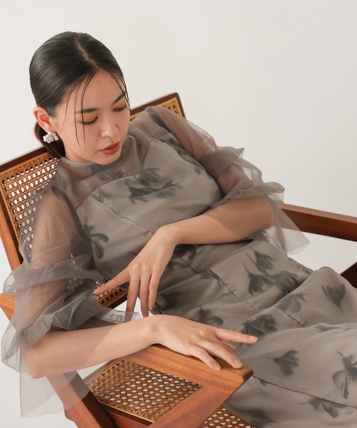 フラワー柄シアー素材を重ねた、上品な透け感のワンピースドレス。 Iラインシルエットで大人っぽく、結婚式やお呼ばれにおすすめの一着です。 ■ Design ■ 軽やかな透け感と繊細なフローラルモチーフが魅力の「シアーチュールフラワードレス」。 身頃には淡い花柄を優しく表現し、柔らかな光沢を放つチュールで包み込むことで、見る角度や光の加減によって奥行きのある表情を見せてくれます。 袖はあえて柄を入れず、透明感のあるチュール素材のみで仕立て、ふんわりとした段チュールが手元を華やかに演出。 動くたびに揺れるシルエットが、さりげなく視線を惹きつけます。 ■ Styling ■ 全体は体のラインを拾いすぎないIラインシルエットで、スタイルアップ効果も抜群。 バックファスナー仕様で着脱もスムーズです。 春夏のガーデンパーティーやリゾートでのディナー、特別なお呼ばれシーンなど、昼夜問わず幅広く活躍します。 ヒールやパールアクセサリーを合わせればフォーマルに、フラットシューズやカゴバッグで合わせればカジュアルダウンも可能。 1枚で着映えする、ワードローブに加えておきたい主役級ドレスです。 ■ おすすめのシーン ■ 結婚式・披露宴・二次会(2次会)・ブライダル・お呼ばれ・ パーティー・女子会・同窓会・謝恩会・演奏会・式典・お食事会・発表会・両家顔合わせなど様々なフォーマルシーンにお勧めです。 【注意事項】 ※商品を使用前に、タグ等に記載されている「取り扱い上の注意書き」、「洗濯表示」を必ずご確認ください。 ※商品写真はできる限り実物の色に近づけるよう徹底しておりますが、撮影環境、お使いのモニター設定やお部屋の照明等により実際の商品と色味が異なる場合がございます。 あらかじめご了承ください。 アイテムサイズ S 着丈(SNP):123cm バスト:89cm ウエスト:66cm ヒップ:91cm 肩幅:31cm 袖丈:44cm 袖口:28cm M 着丈(SNP):125cm バスト:93cm ウエスト:70cm ヒップ:95cm 肩幅:32cm 袖丈:45cm 袖口:29cm モデル 164cm Mサイズ着用