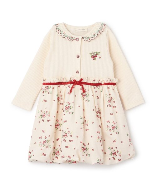 ソフトなタッチで伸縮性のあるカットソーと野イチゴ柄のビエラを組み合わせたドッキングワンピースです。衿元に配したレースフリルや程よく膨らみを持たせたバルーン裾がポイント。裾はゴムで絞り、歩きやすく仕上げています。着崩れる心配がなく、一枚でコーディネートが決まる優秀アイテムです。【おすすめの着用時期は秋冬シーズン】【透け感】透けない【生地の厚さ】普通【伸縮性】あり【裏地】なし【ポケット】なし【アジャスター】なし